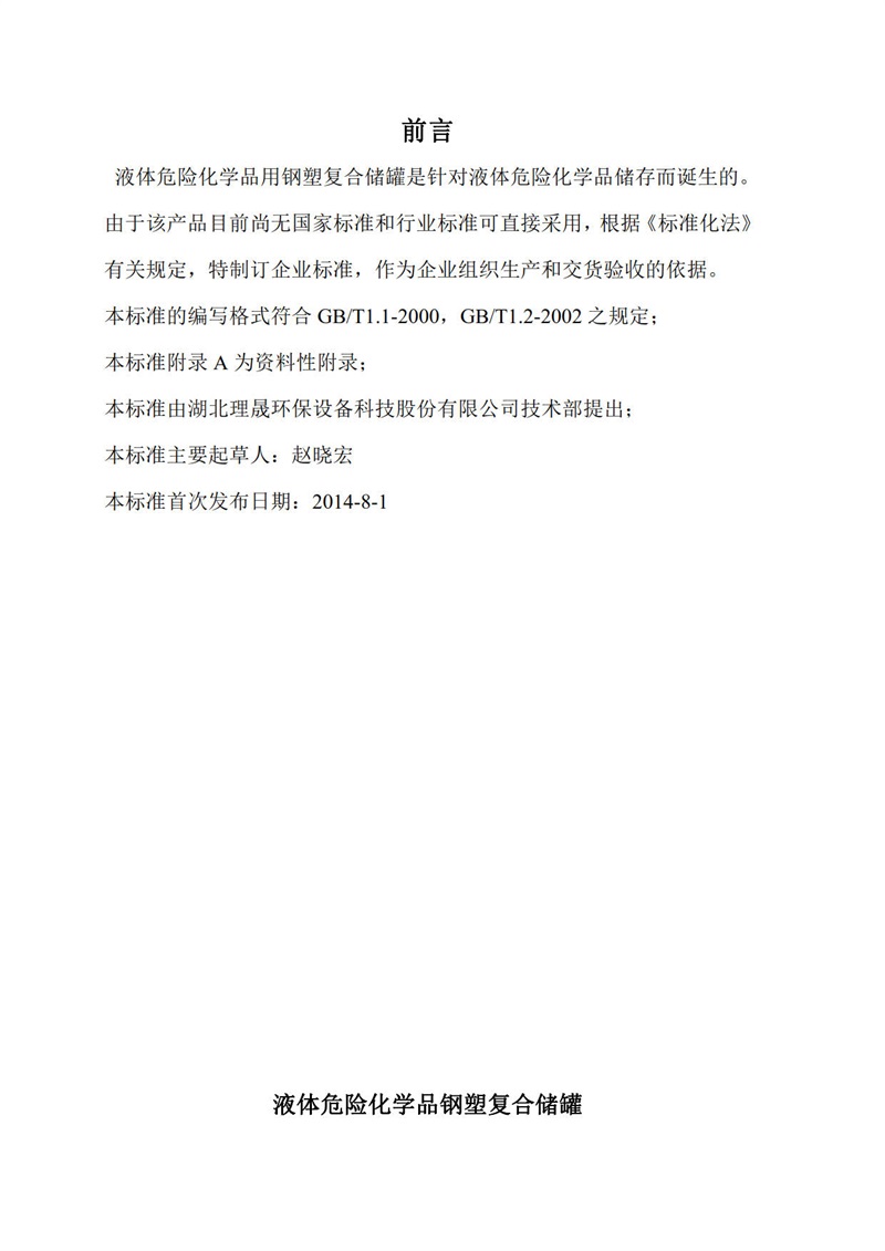 液態(tài)危險(xiǎn)化學(xué)品用鋼塑復(fù)合儲(chǔ)罐企業(yè)標(biāo)準(zhǔn)點(diǎn)擊查看:鋼襯塑儲(chǔ)罐企業(yè)標(biāo)準(zhǔn)